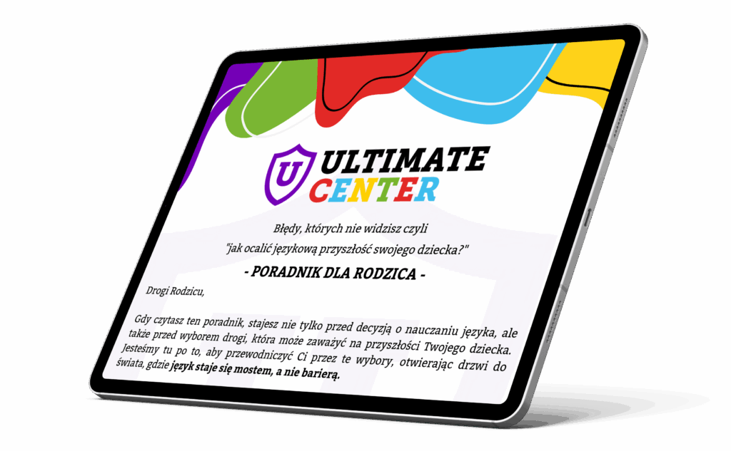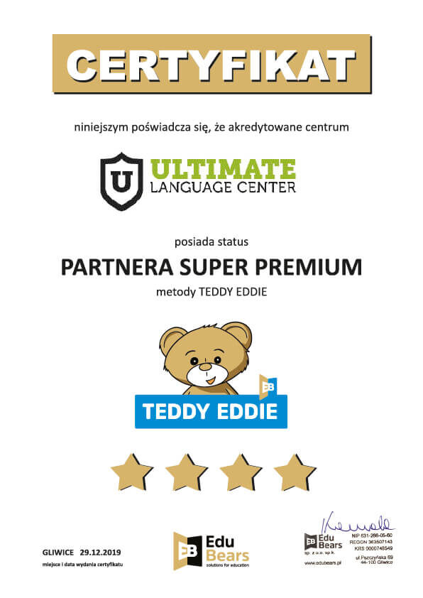 DOSKONAŁA Na podstawie 100 opinii Amel Bodnar2023-06-07Trustindex sprawdza, czy pierwotnym źródłem recenzji jest Google. Bardzo lubię to miejsce ponieważ są bardzo fajne i ciekawe lekcje, na których można się dużo nauczyć i nauczycielka jest miła fajna pozdrawiam panią Ale Wojtek Przybylski2023-06-07Trustindex sprawdza, czy pierwotnym źródłem recenzji jest Google. Podoba mi sie tutaj, ponieważ dużo sie nauczyłem i podniosłem swój poziom angielskiego. Nauczyciele są bardzo fajni, mili i pomocni. Polecam 😎 Michał Olejnik2023-06-07Trustindex sprawdza, czy pierwotnym źródłem recenzji jest Google. Cenię Ultimate bo można się dużo nauczyć i nauczyciel jest fajny. Lubię to miejsce dlatego że chodzą tam moi koledzy z klasy i mogę się z nimi uczyć Ign P2023-06-02Trustindex sprawdza, czy pierwotnym źródłem recenzji jest Google. Polecam ultimate ponieważ są fajne lekcje i rozwinąłem tu umiejętności językowe :) chętnie chodzę na te zajęcia 😊 trzmieler2023-06-02Trustindex sprawdza, czy pierwotnym źródłem recenzji jest Google. Polecam Ultimate bo jest to bardzo dobra szkoła nauczyłem się angielskiego i są fajne gry edukacyjne i są mili nauczyciele 🇬🇧🔥 Dorota Ryta2023-06-01Trustindex sprawdza, czy pierwotnym źródłem recenzji jest Google. Bardzo dobra szkoła, zajęcia prowadzone sumiennie , dopasowane do poziomu uczniów.Polecam Bogusia Przybylska2023-05-31Trustindex sprawdza, czy pierwotnym źródłem recenzji jest Google. Ultimate Center to najlepsza szkoła do jakiej mogły trafić moje dzieci! Polecam z czystym sumieniem. Cechuje ją nie tylko wysoki poziom nauczania - ale indywidualne podejście do każdego ucznia i rodzica - co cenię sobie najbardziej. Kontakt z nauczycielami, informacje o postępach, zwrócenie uwagi na to z czym sobie dziecko nie radzi - ja tego oczekiwałam - i się nie zawiodłam. Dla dzieci młodszych - program TEDDY EDDIE - strzał w dziesiątkę! Młodszy syn bardzo chętnie uczestniczył w zajęciach - bo są połączeniem zabawy i nauki. Programy edukacyjne skierowane do młodzieży - prowadzone są z dwójką lektorów - polsko-języcznym i angielsko-języcznym co urozmaica zajęcia i daje dzieciom odpowiedni punkt odniesienia. Do zajęć wykorzystywane są świetne książki - i platforma do nauki online (dodatkowe ćwiczenia i zadania - które są rewelacyjnym narzędziem do powtórek materiału - oczywiście jeśli uczestnik zajęć znajdzie czas i chęci.... :) ) Sama mam ochotę wrócić do szkoły widząc zaangażowanie nauczycieli i postępy dzieci :)