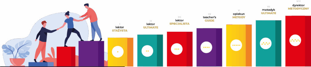 Chociaż dzisiaj możesz zaczynać jako stażysta, albo początkujący lektor, to wiedz, że tych szczebli kariery jest u nas sporo. Od Twojego zaangażowania, nakładu czasu pracy zależy, kiedy dosięgniesz fotelu dyrektora.